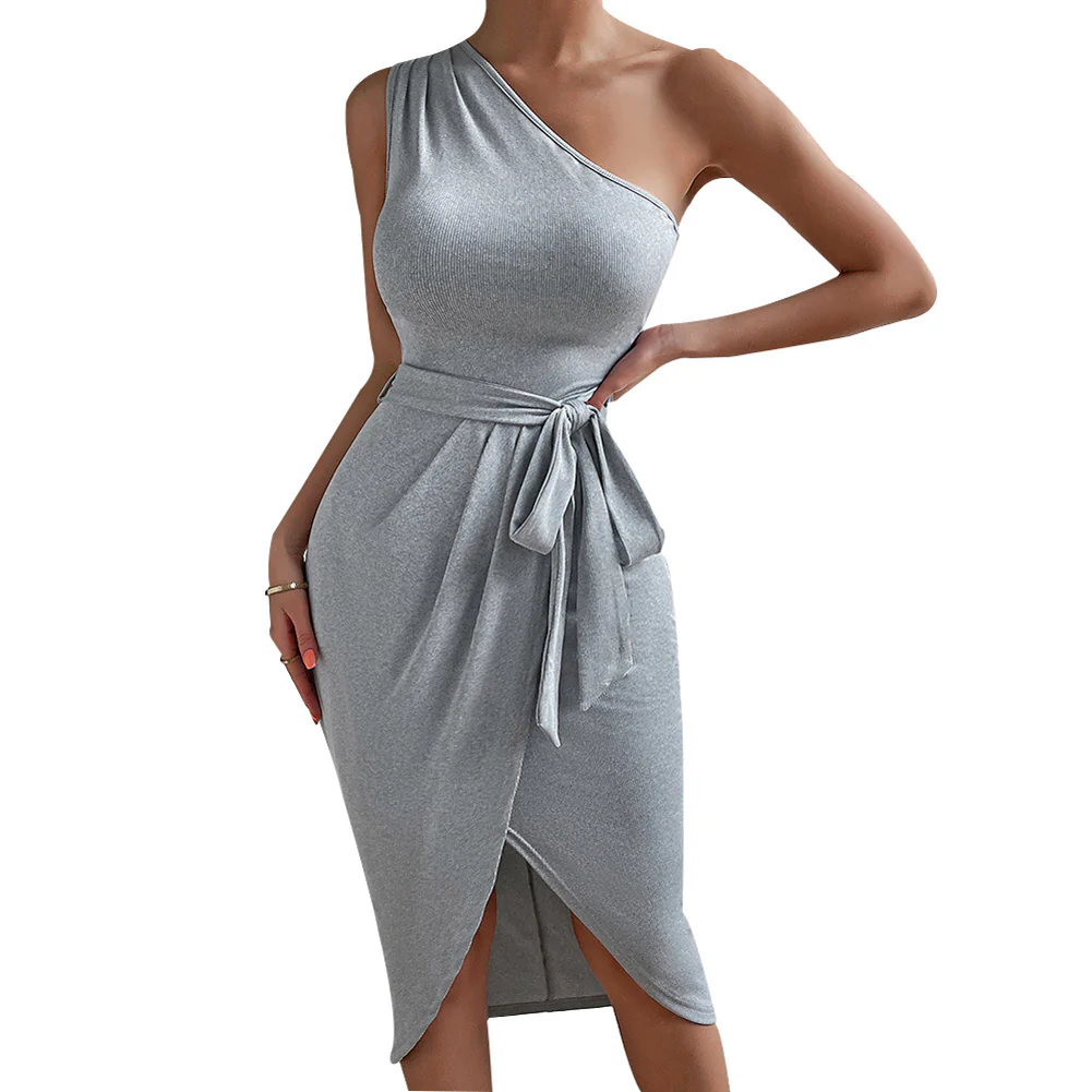 YESFASHION Fashion One Shoulder Dress For Women Elegant Slimming Lace-up Bodycon Skirt Simple Solid Color Pullover Dress Brand YESFASHION Color Grey Style Party Pattern Type Plain Details Sling,Belt Type Bodycon Neckline Spaghetti Strap Sleeve Length Sleeveless Sleeve Type No Waist Line High Waist Hem Shaped Slit Lengt