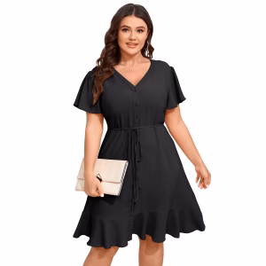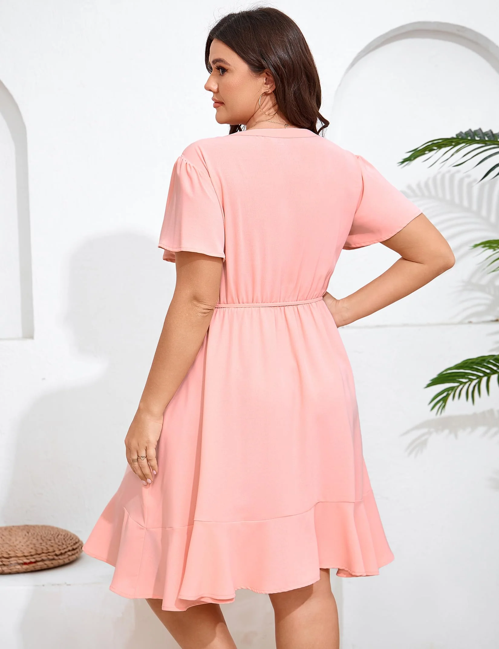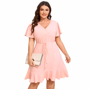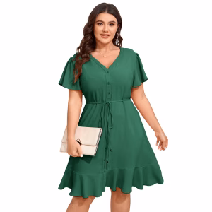 - This casual summer dress for plus size women features a knee length, v neck, short sleeves, high waist, pleated ruffle hem, and a flowy and casual style. It comes in solid colors: black, pink and green. Available in five sizes: X, 2X, 3X, 4X, and 5X.